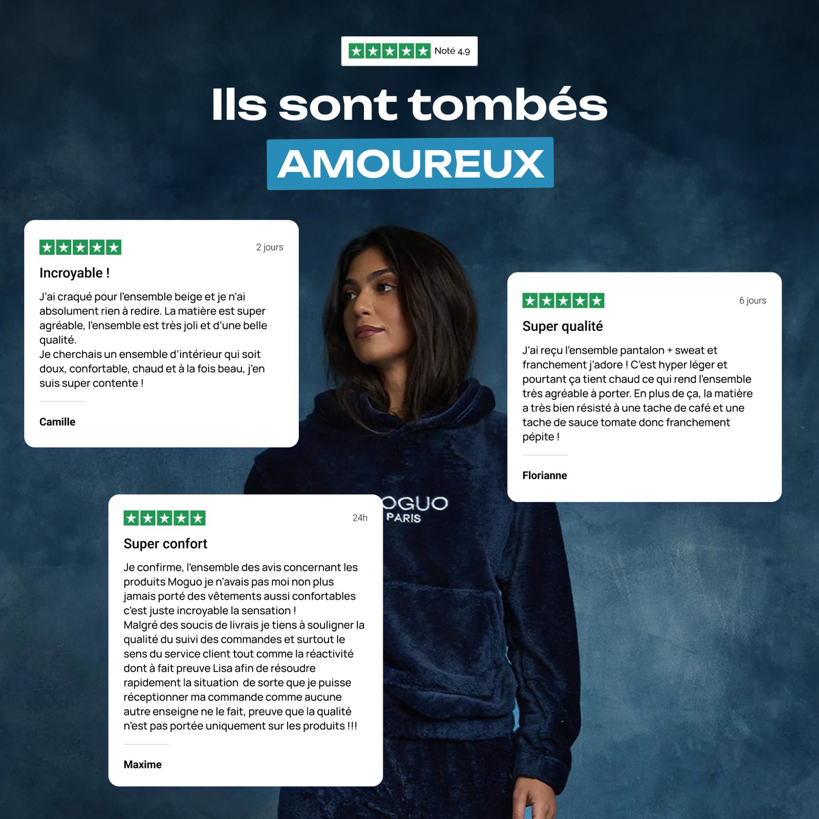 Moguo Paris a été créée avec l’ambition de révolutionner le confort. Nous concevons des vêtements alliant qualité exceptionnelle et engagement durable. Chaque pièce est imaginée en France et fabriquée au Portugal, dans le respect des normes les plus exigeantes, avec une certification Oeko-Tex garantissant des textiles sans substances nocives. Notre mission : offrir un bien-être au quotidien.