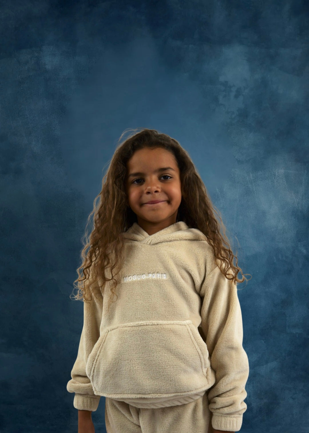 Les pièces Moguo Paris sont unisexes et pensées avec une coupe naturellement légèrement ample, que ce soit pour le sweat ou le pantalon. Les lignes restent droites pour un tombé propre et confortable, sans effet trop large.